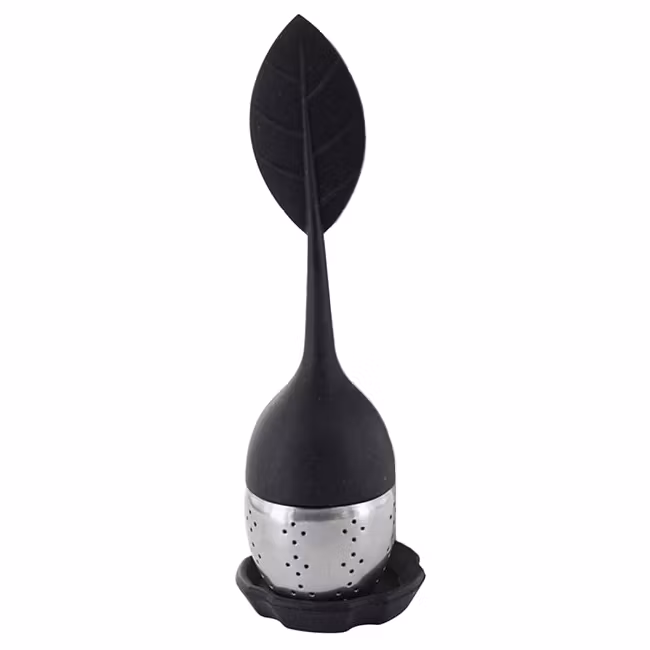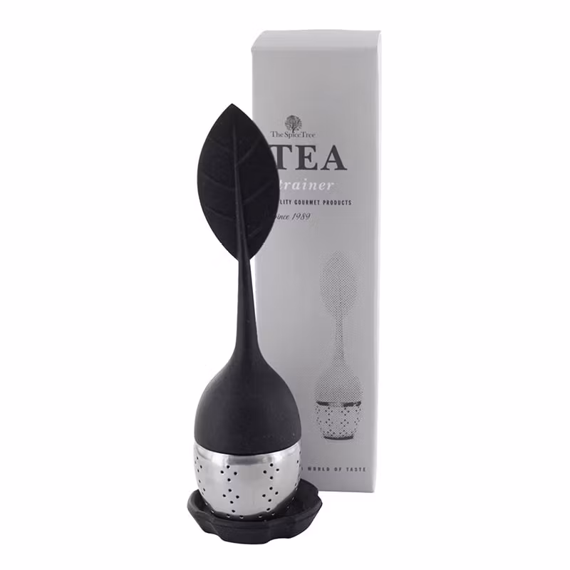 Tesil i snygg design med ett löv i topp. Det medföljer en liten platta att ställa tesilen på.