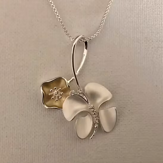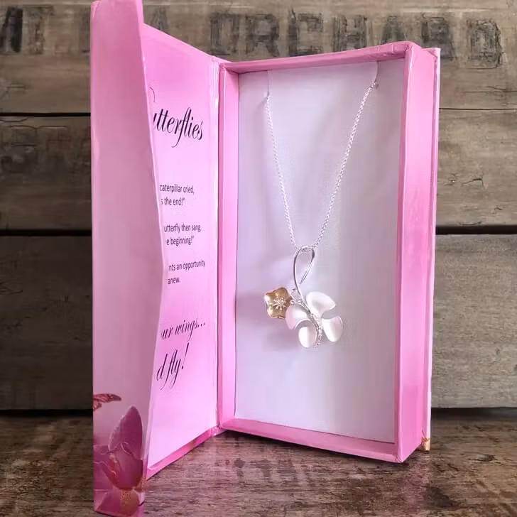 Halsband med en abstrakt fjäril i en matt, borstad silverfärg. Fjärilen kantas av glänsande silverfärg och accentuerad av härligt gnistrande kubisk zirkonia längs kroppen samt längst ute på antennerna. Fjärilen sitter med hjälp av en mjuk ögla ihop med en silver- och blekt guldfärgad blomma. Hängsmycket hänger i en robust kedja, vars längd är justerbar. Halsbandet levereras i en fin ask som tillsammans blir en hjärtlig present.