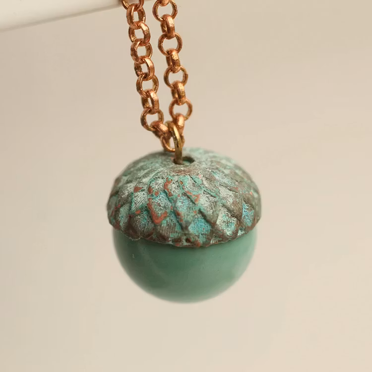 Elegant halsband i form av ett ekollon med en mjölkigt turkos Swarovski glaspärla. Hatten är tillverkad av koppar som behandlats för att få fram ärgfärgade toner i turkos och grönt. Små detaljer av kopparn skymtar fram och ger en unik finish.