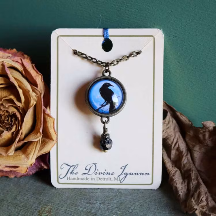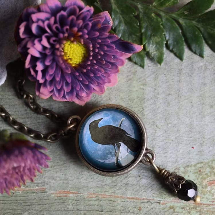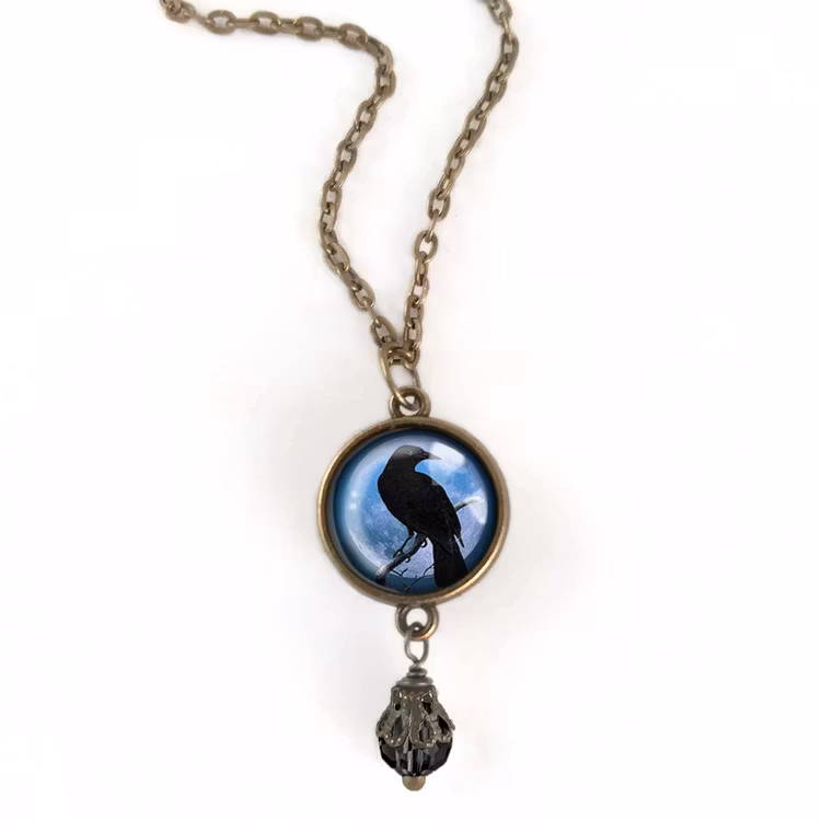 Halsband, dubbelsidig berlock med pärla – Kråkfågel, blå måne