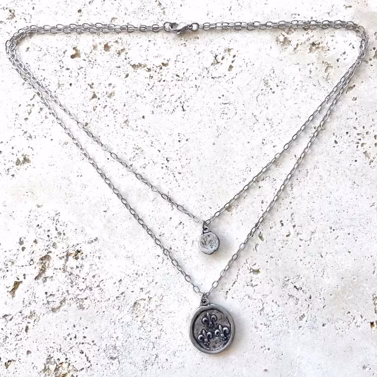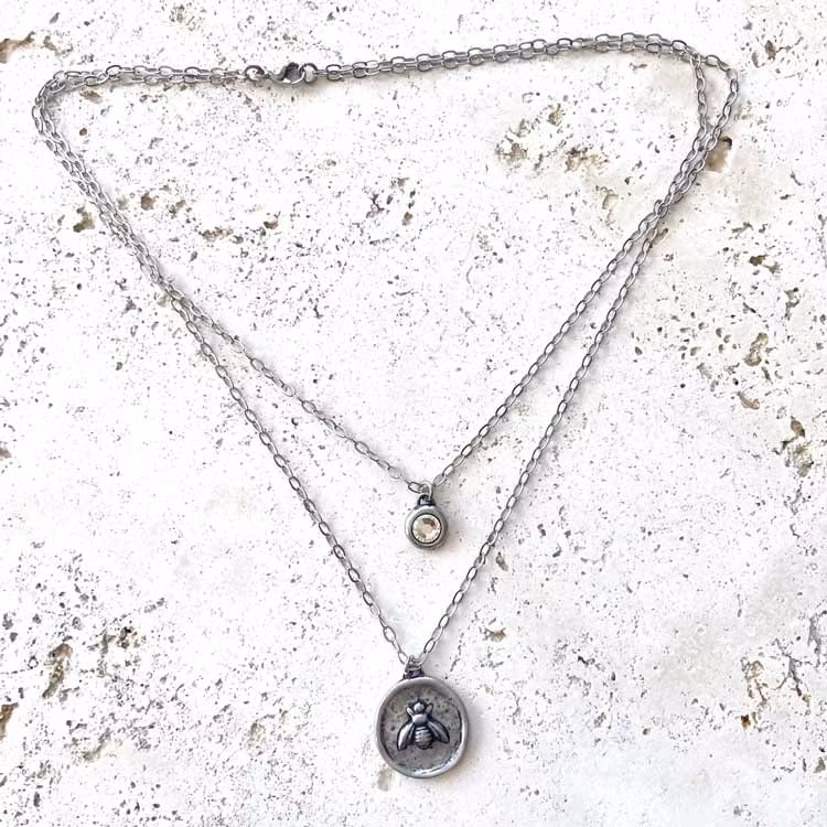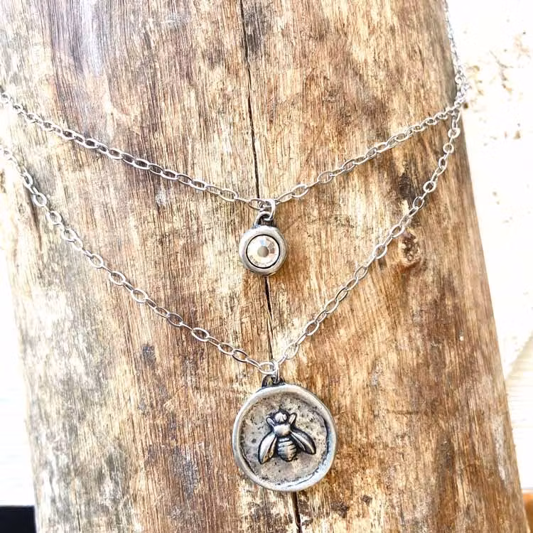 Halsband med dubbla kedjor och hängen. Ett litet hänge med en kristall samt ett stort mynthänge med ett bi. På baksidan av myntet finns tre franska liljor. En liten fin extradetalj är att det även sitter en liten kristall längst ut på kedjan där man knäpper halsbandet.