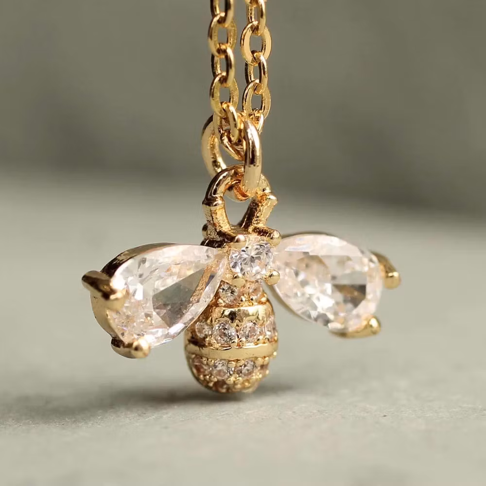 Sött och elegant halsband med ett detaljrikt bihänge i guldpläterad mässing. Vingarna pryds av slipade glaskristaller och kroppen är dekorerad med tre rader små pavéinfattade kristaller som ger ett vackert randigt uttryck. Ett nätt, men samtidigt iögonfallande smycke som passar både till vardag och fest.