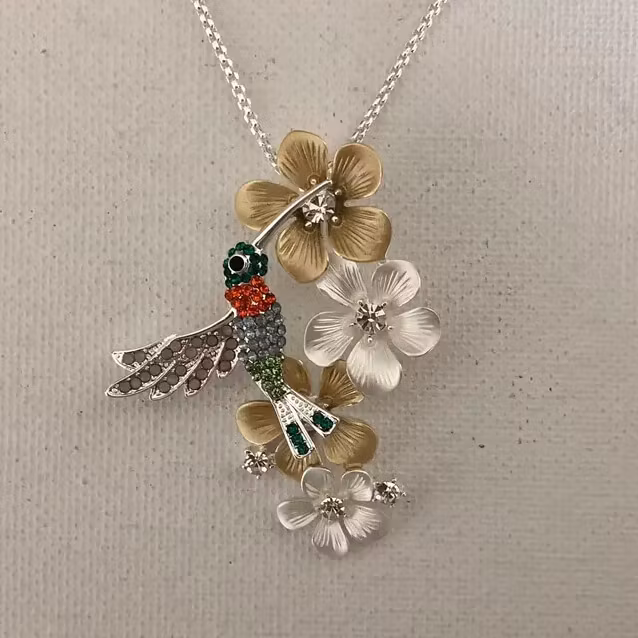 Halsband – Blommor i guld- & silverton med kulört kolibri