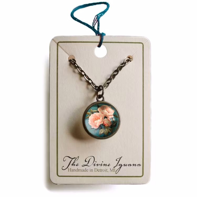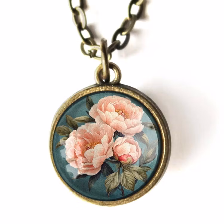 Vintageinspirerat halsband med antikbronsfinish. Hänget har samma illustration av rosa pioner på båda sidorna under cabochoner av glas.