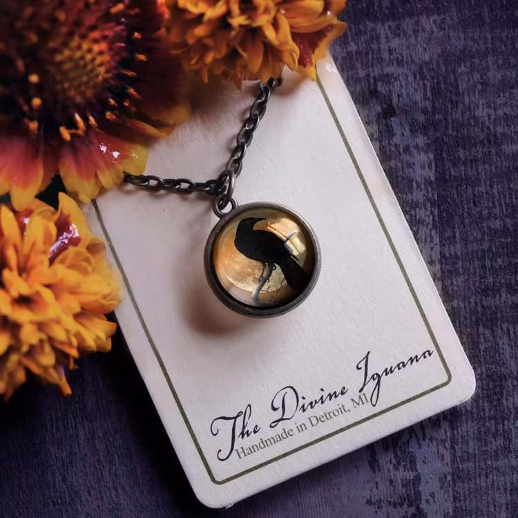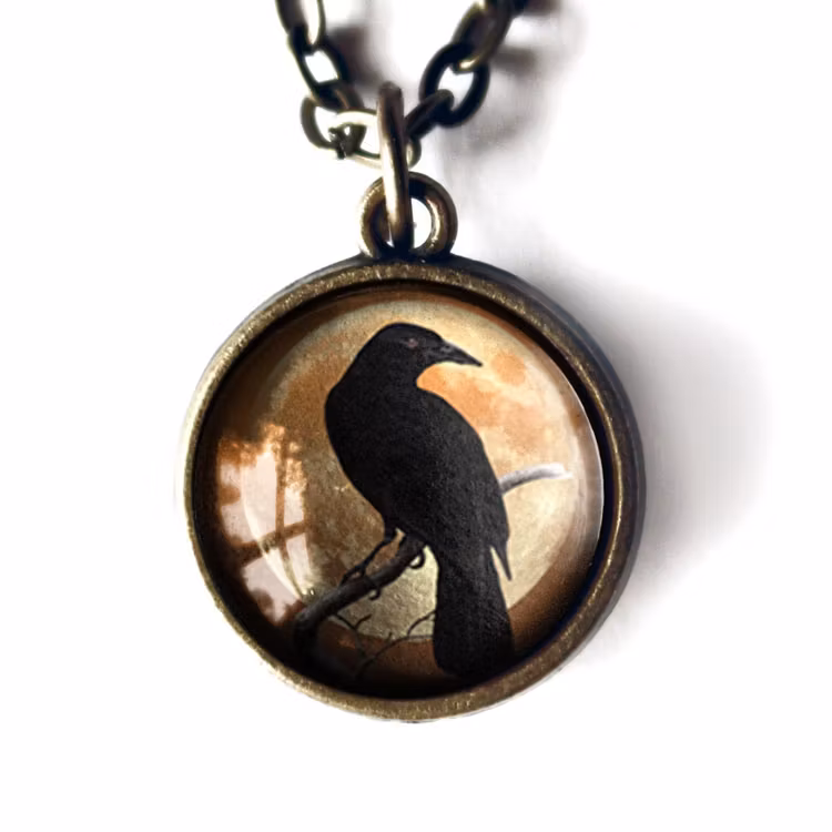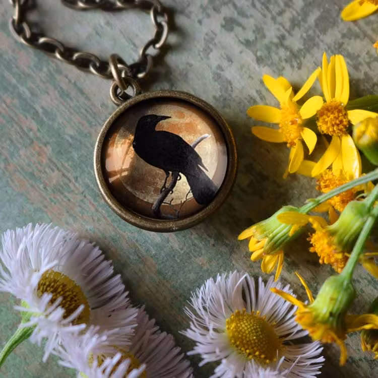 Halsband, dubbelsidig berlock – Kråkfågel, orange måne