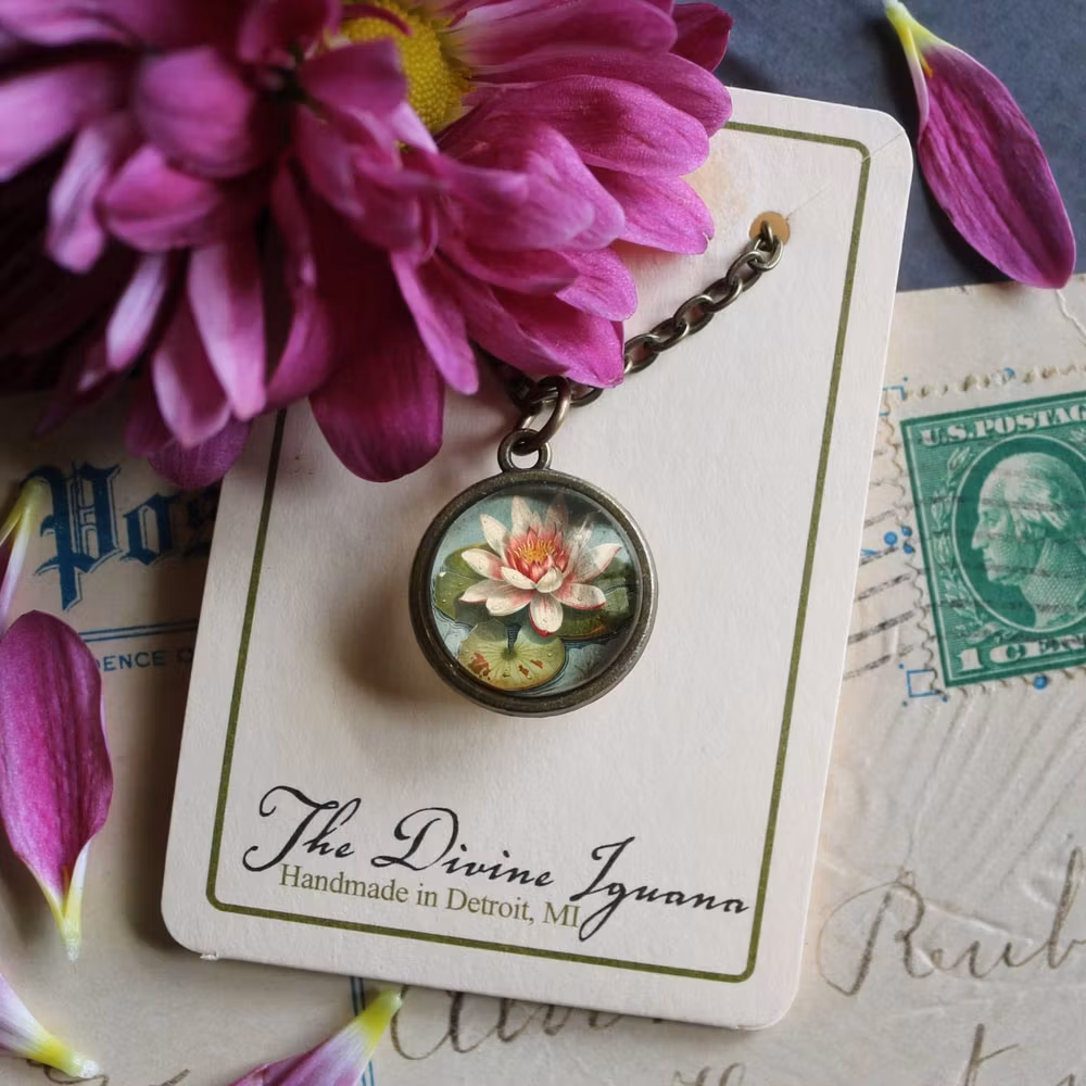 Vintageinspirerat halsband med antikbronsfinish. Hänget har samma illustration av en näckros på båda sidorna under cabochoner av glas.