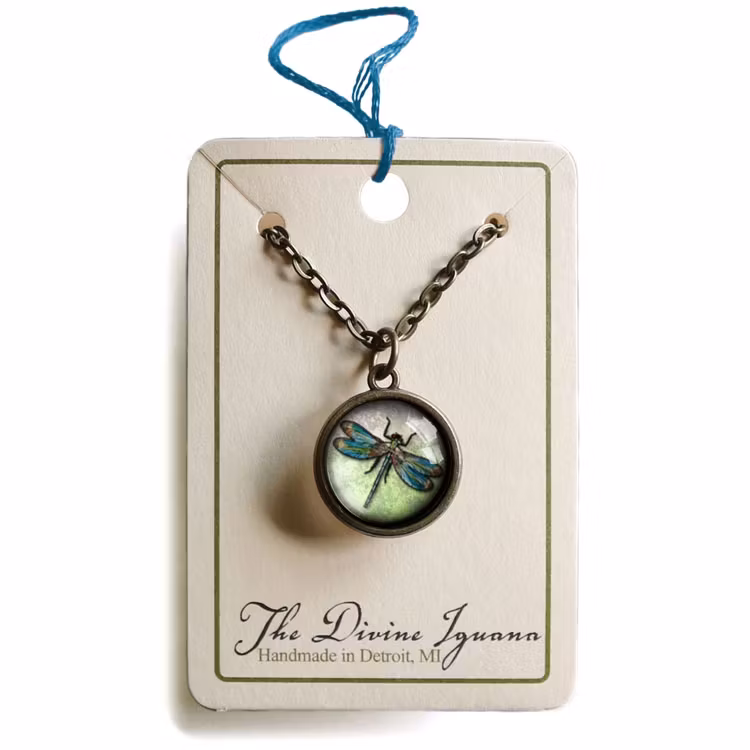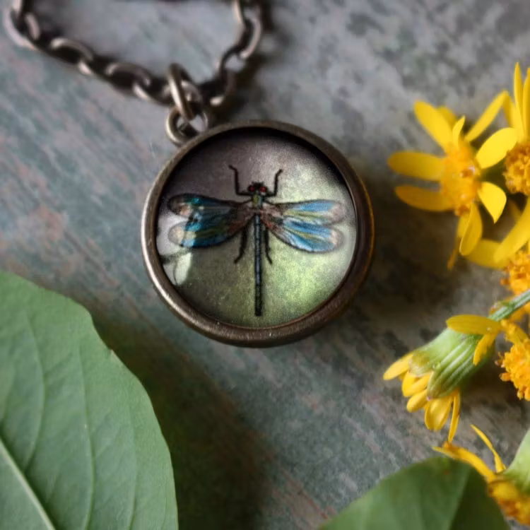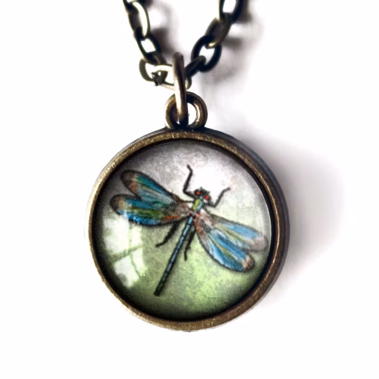 Vintageinspirerat halsband med antikbronsfinish. Hänget har samma illustration av en trollslända på båda sidorna under cabochoner av glas.