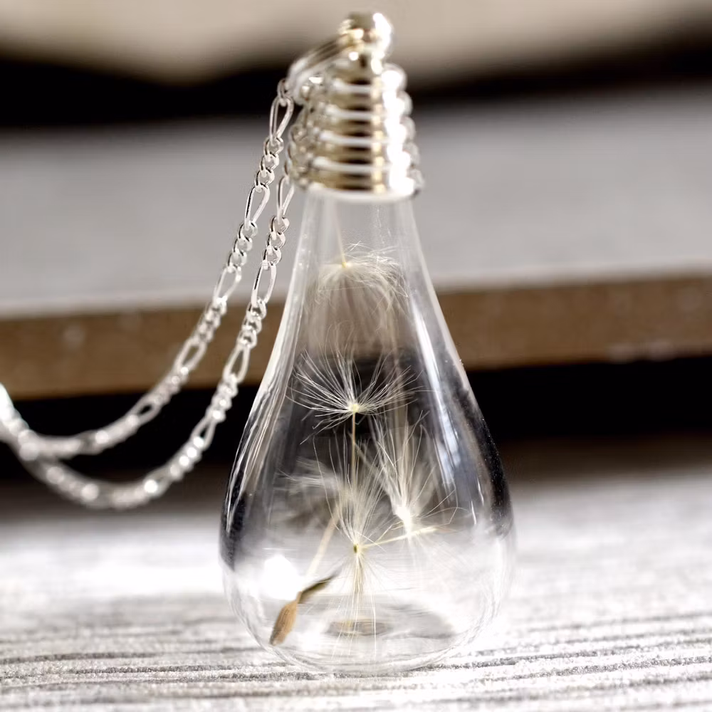 Halsband – Maskrosfrön i glasdroppe, silver