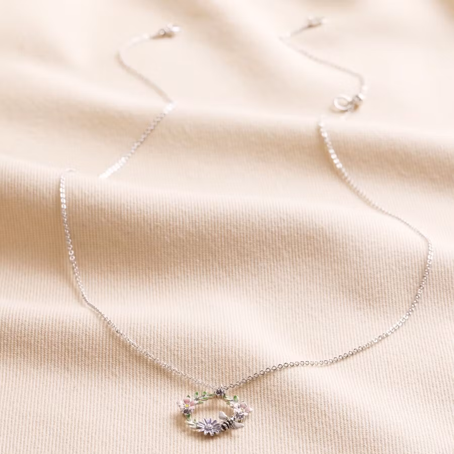 Halsband med en somrig krans av blommor i rosa, gröna och lila pastellfärger samt lila kubisk zirkonia. Förutom blommor sitter det även ett litet bi på blomsterkransen.