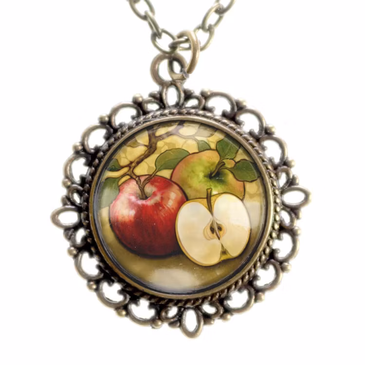 Vintageinspirerat halsband med antikbronsfinish. Hänget har en illustration av äpplen under en cabochon av glas.