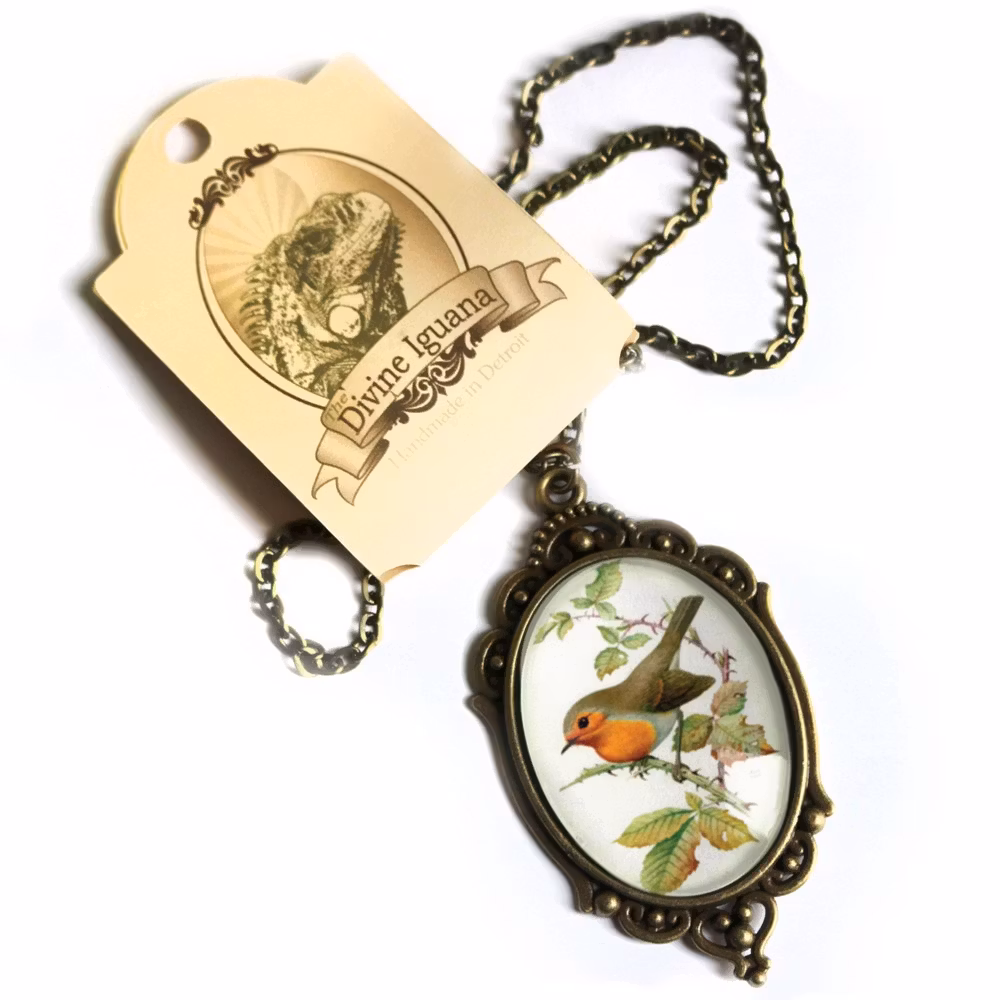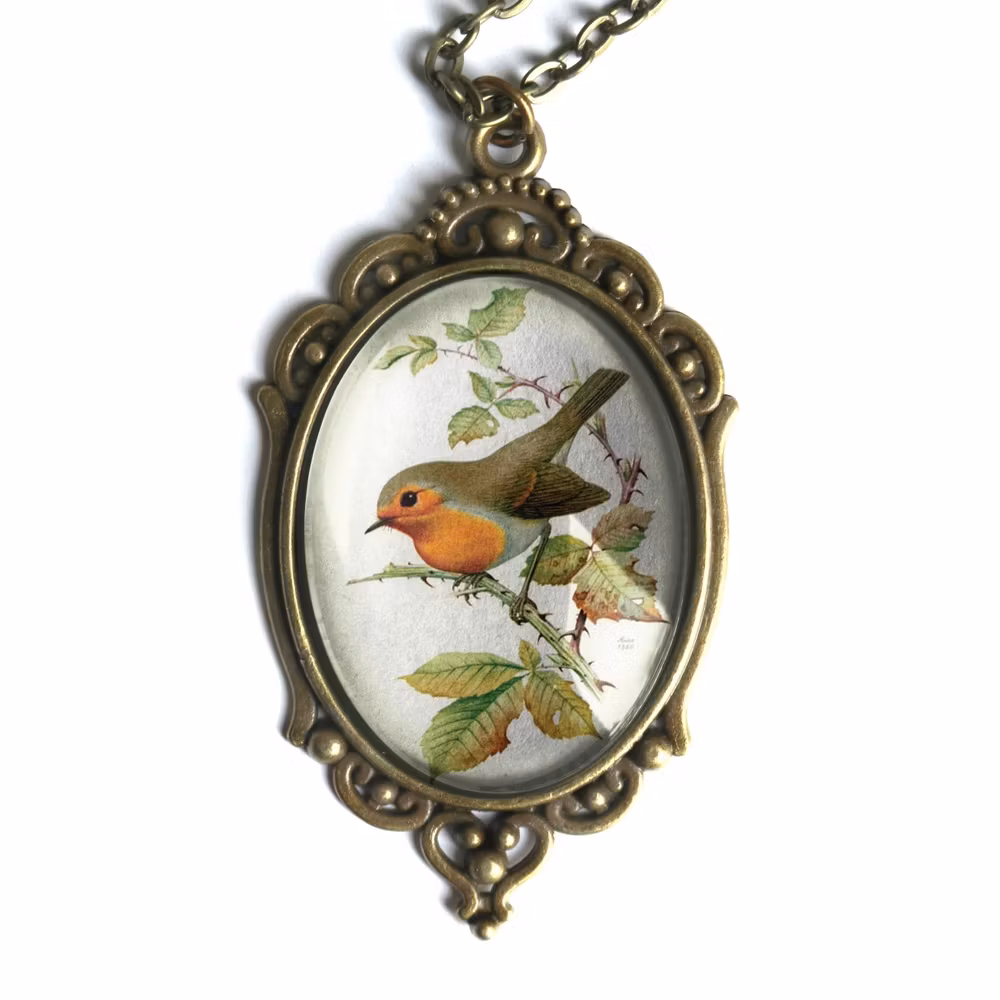 Vintageinspirerat halsband med antikbronsfinish. Det stora hänget har en illustration av en rödhake under en cabochon av glas.