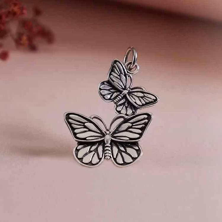 Hänge i silver med två fjärilar i flykt. Fjärilar symboliserar förändring och livets ständiga cykler – en påminnelse om att utveckling är en naturlig del av livet.