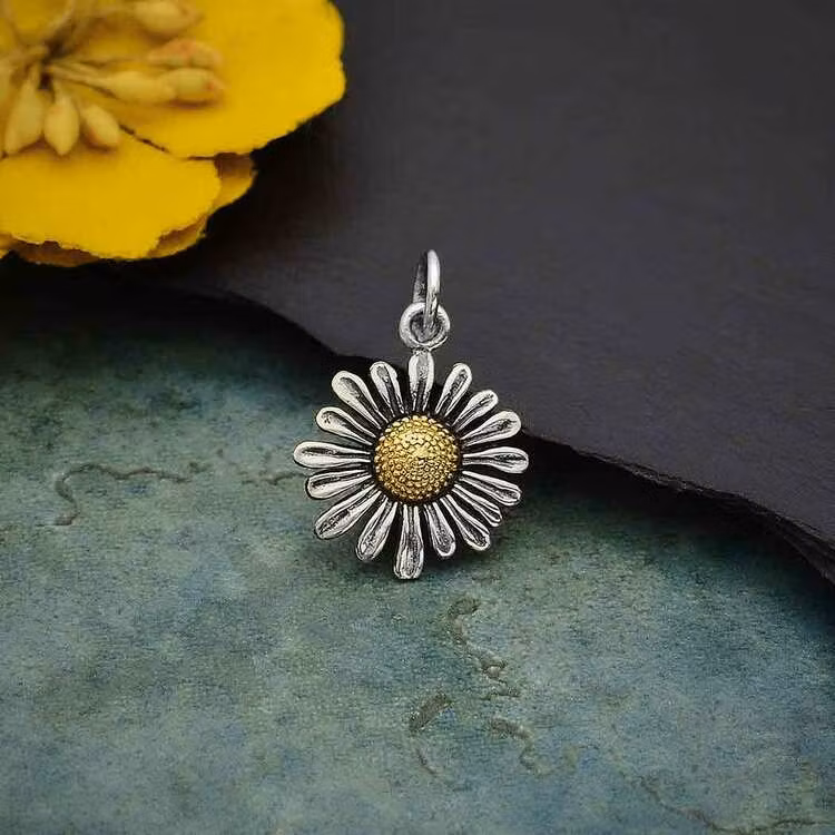 Sött hänge i form av en liten tusensköna. Kronbladen består av silver och mitten av blomman är tillverkad i brons.