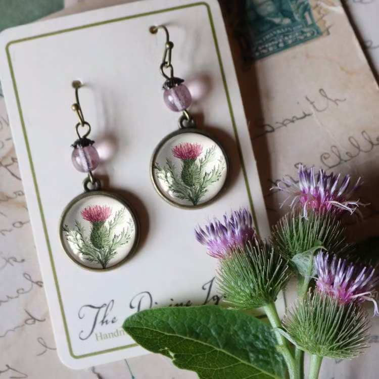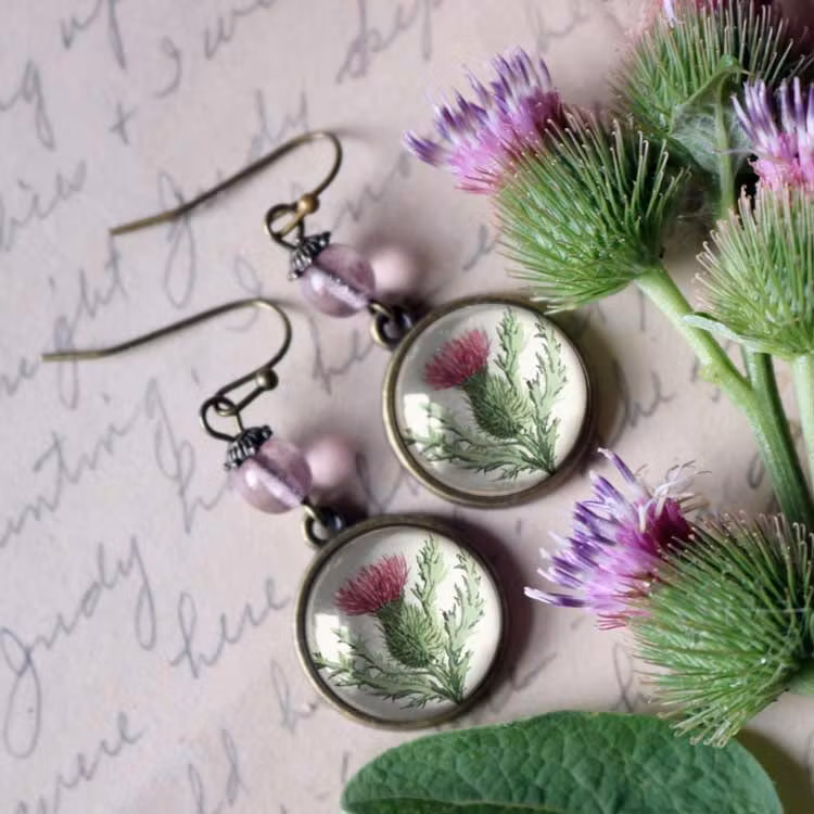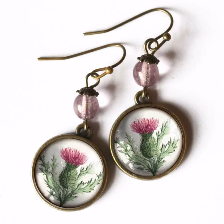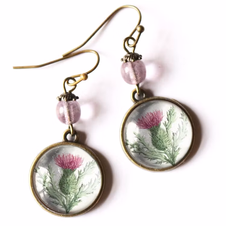 Vintageinspirerade örhängen med antikbronsfinish. Örhängena har en illustration av en tistel under en cabochon av glas samt en liten pärla överst.
