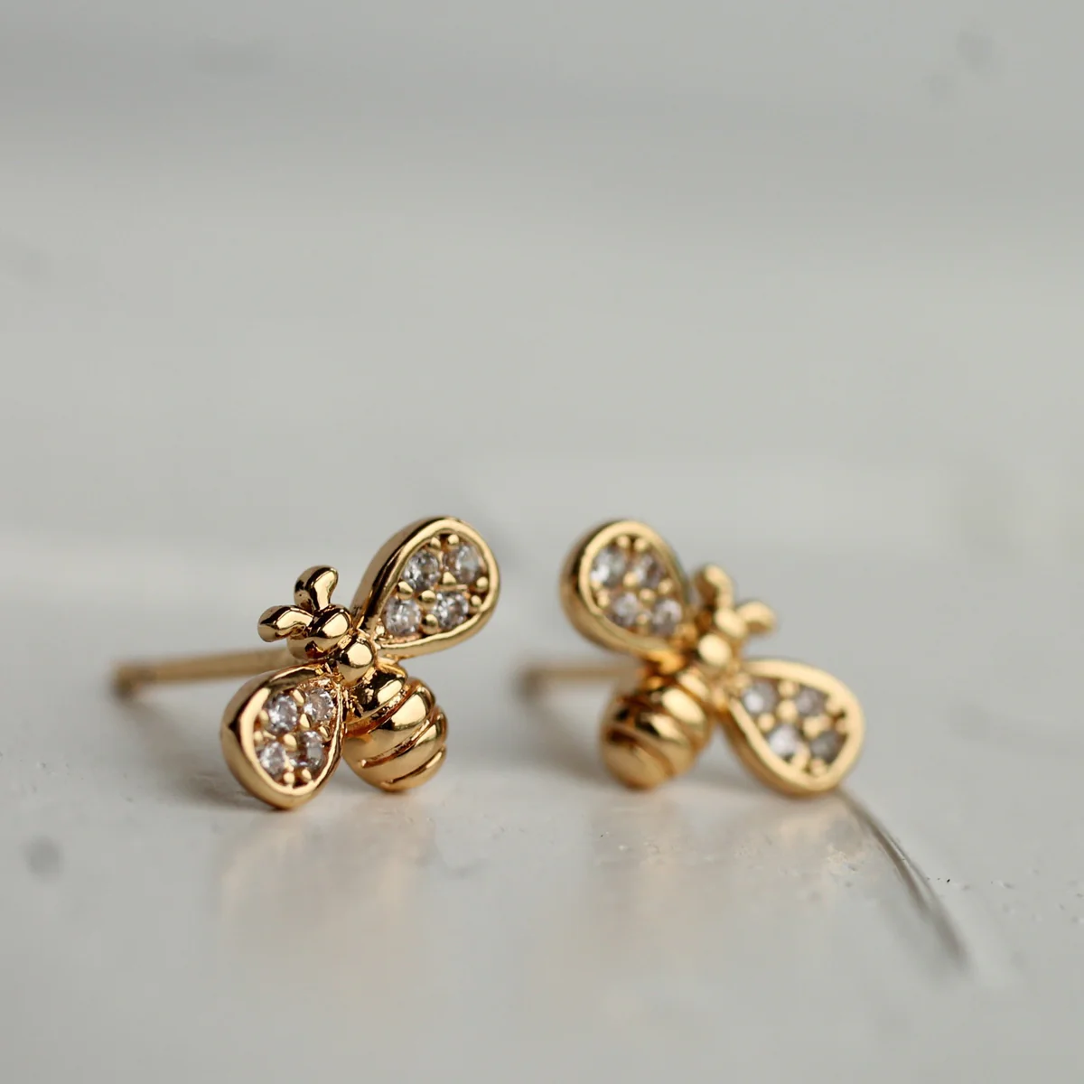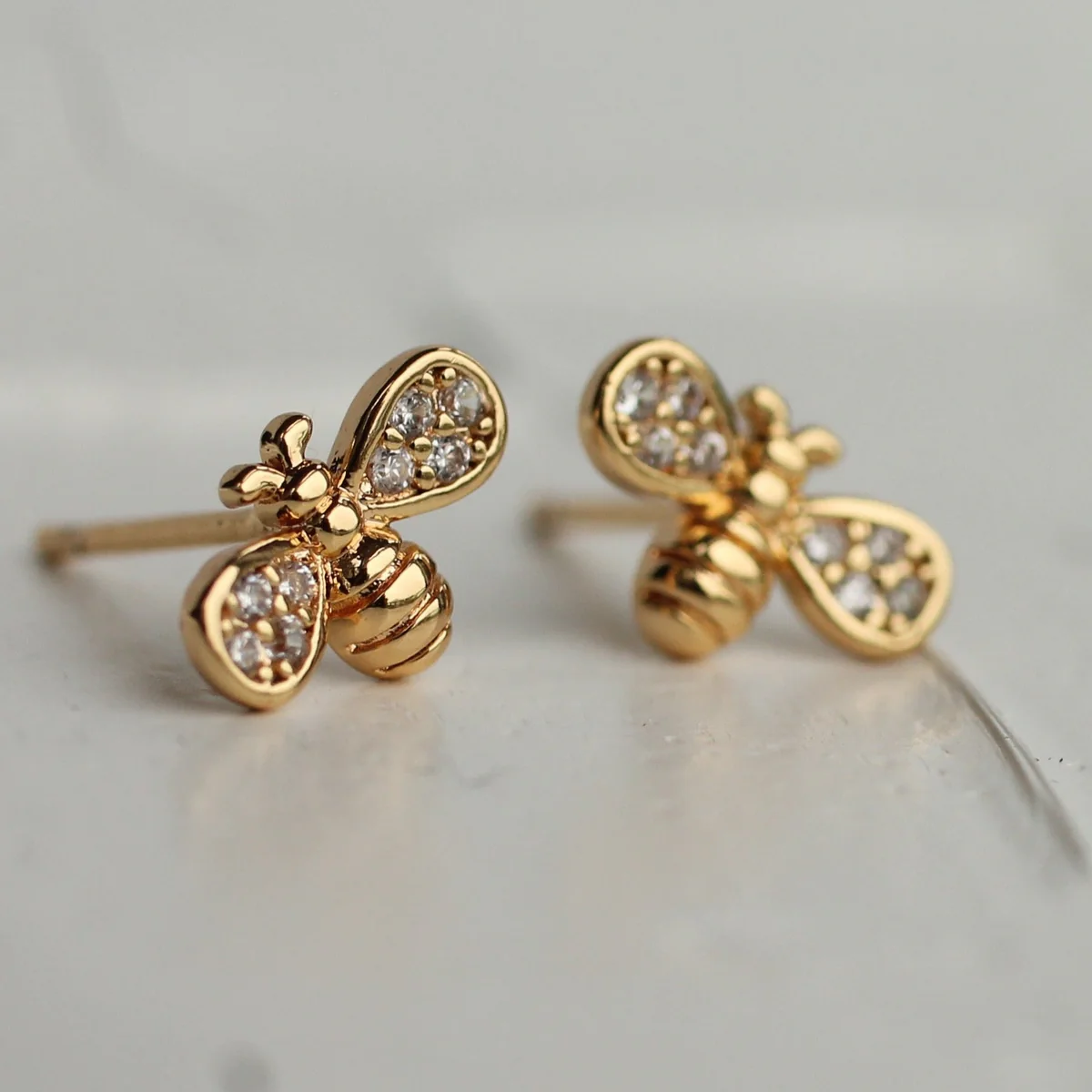 Söta örhängen i form av små bin, tillverkade i guldpläterad mässing och dekorerade med gnistrande små kristaller i vingarna. Den nätta storleken ger ett diskret och elegant uttryck som passar perfekt till både vardag och finare tillfällen.