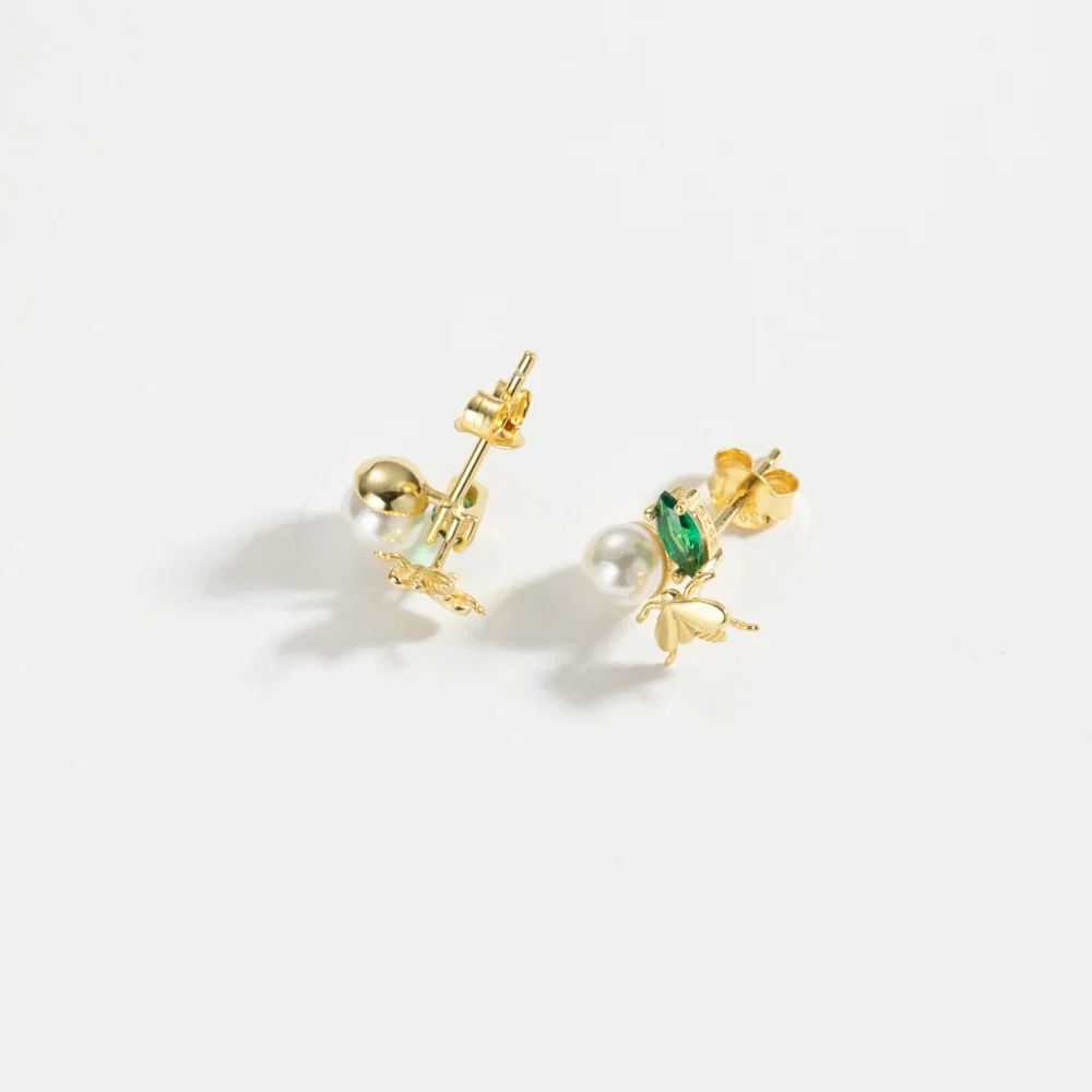 Örhängen – Bi med smaragdgrön zirkonia och vit pärla