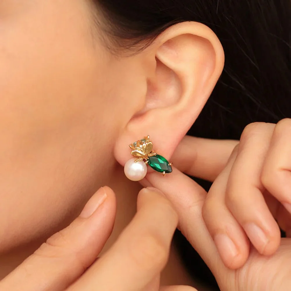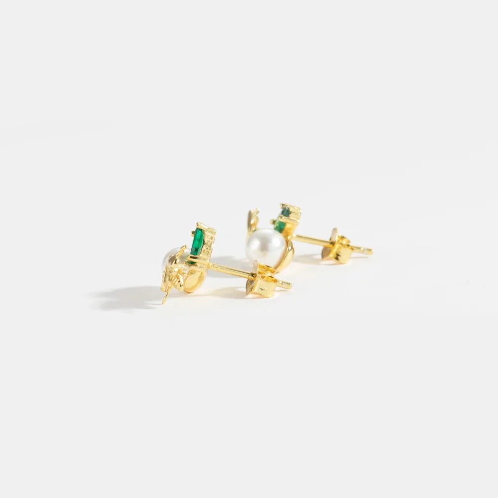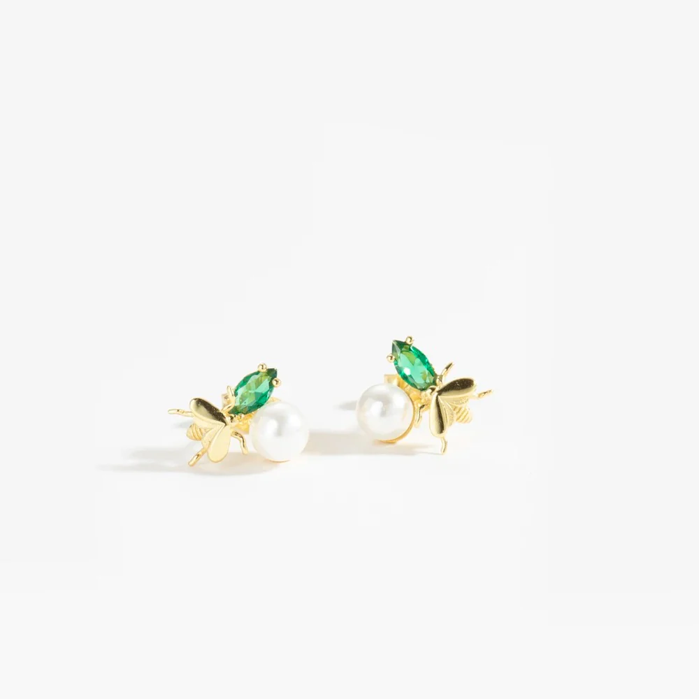 Örhängen i form av bin med infattning av smaragdgrön kubisk zirkonia samt en vit skimrande pärla. Ett smycke som passar både till fest och när du vill addera en lyxig detalj till din vardagslook.