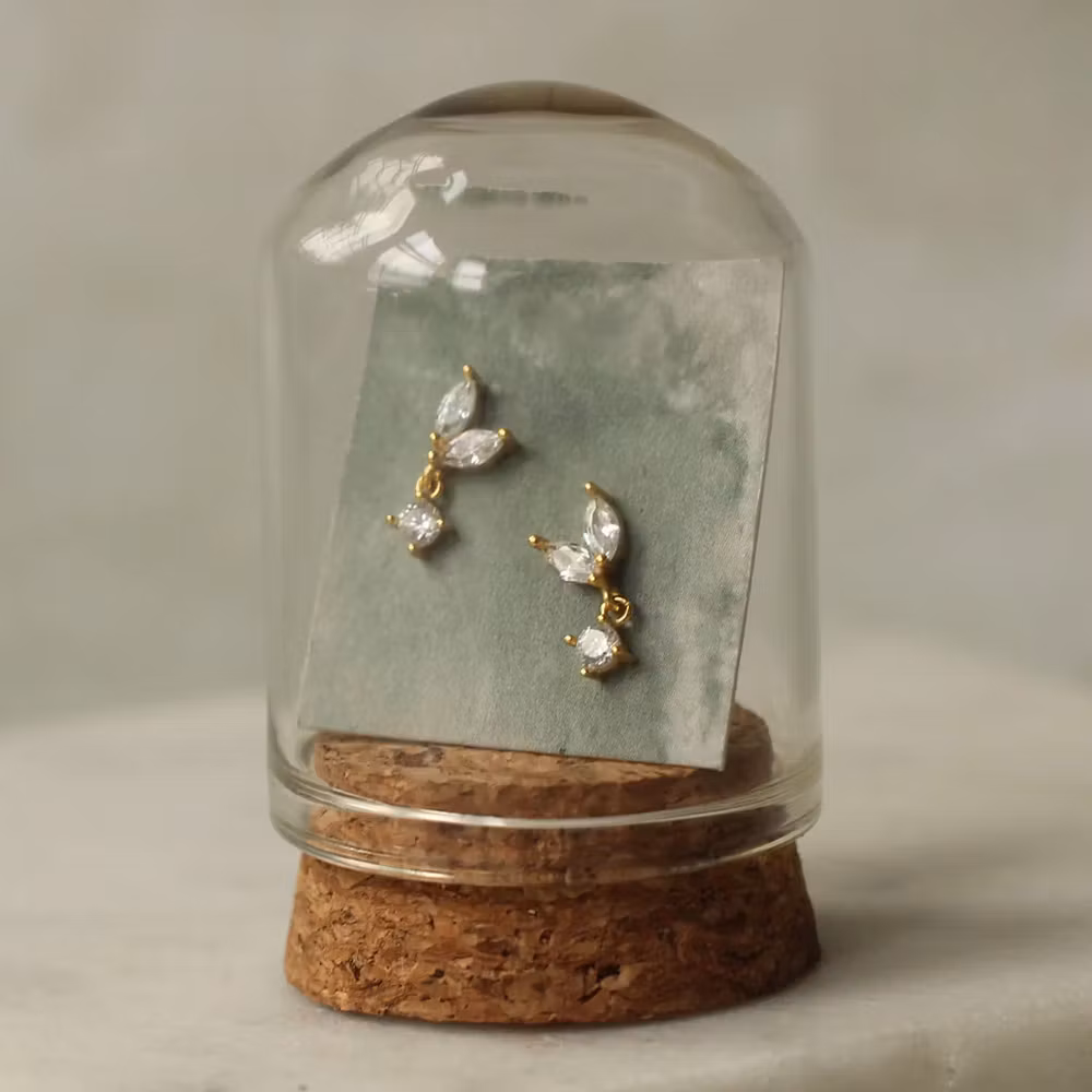Som tillval finns en dekorativ glaskupa med kork som förvandlar örhängena till små samlarobjekt – perfekt som en unik och uppskattad present.