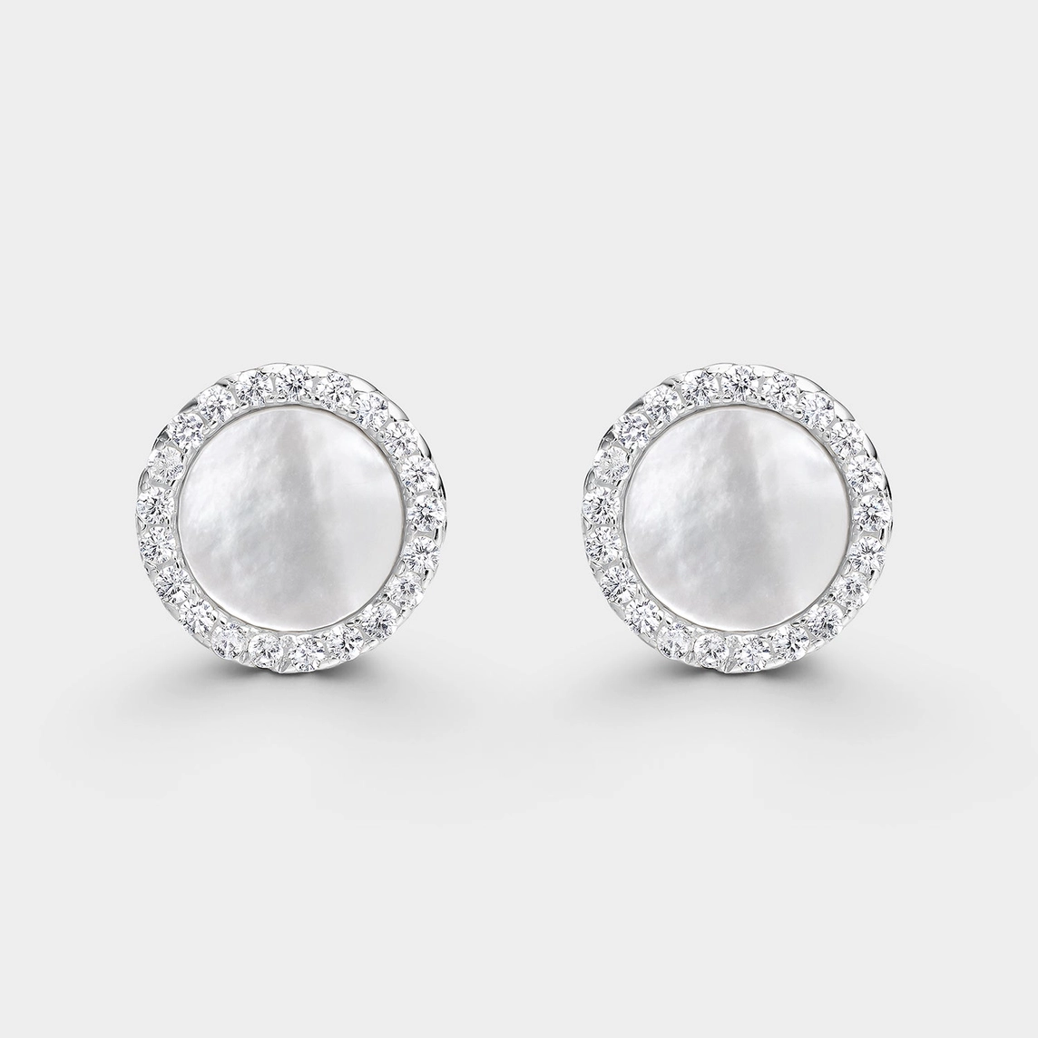 Eleganta örhängen med stora cirklar av pärlemor och vita zirkoner som ger ett sofistikerat och lyxigt intryck. Kombinationen av noggrant utvalda material och exklusiv design gör dem till ett stilfullt val. Perfekta när du vill lyfta din look med en vacker detalj.