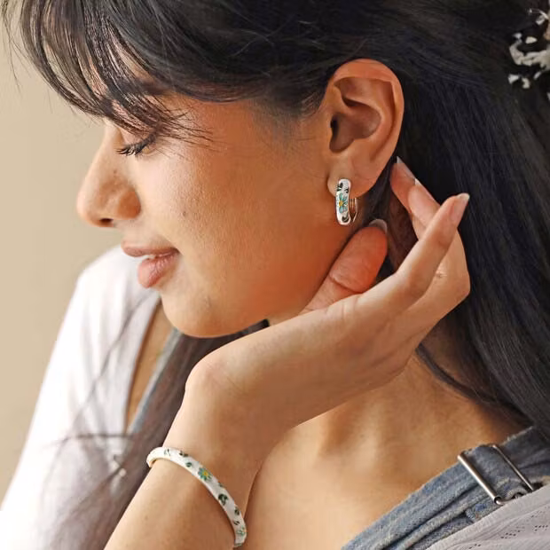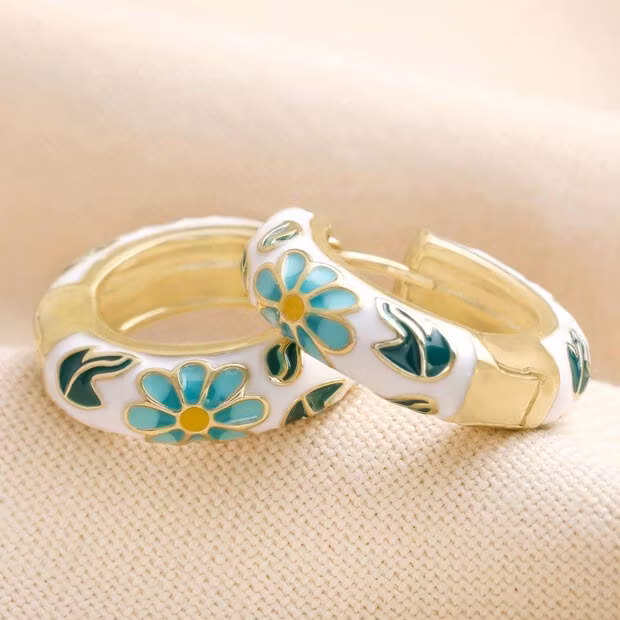 Vackra ringar tillverkade av guldpläterad mässing och försedda med ett blommönster av vit, blå, gul och grön emalj. Örhängena har samma design på varje sida av ringen och är försedda med gångjärn och klicklås för enkel av- och påtagning.