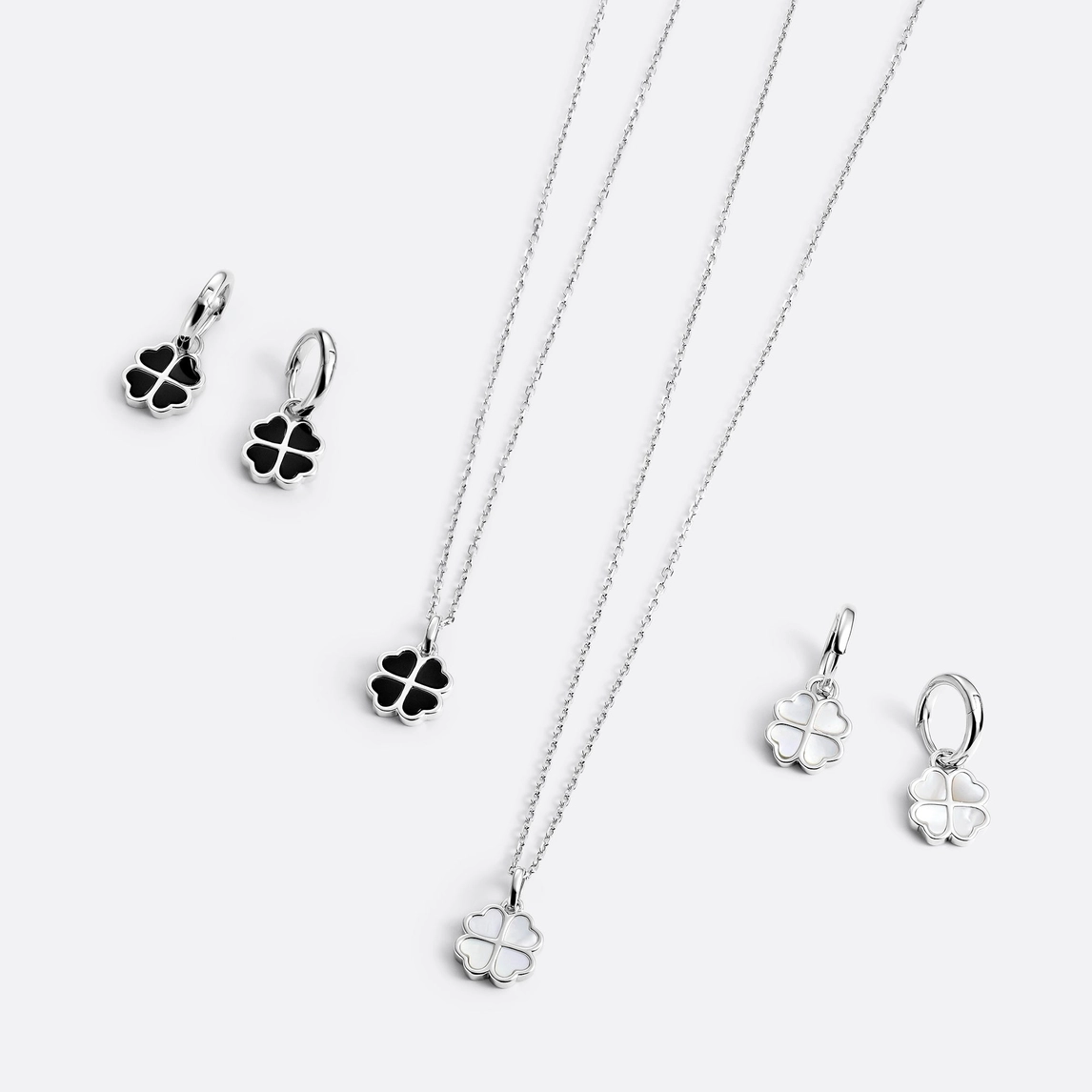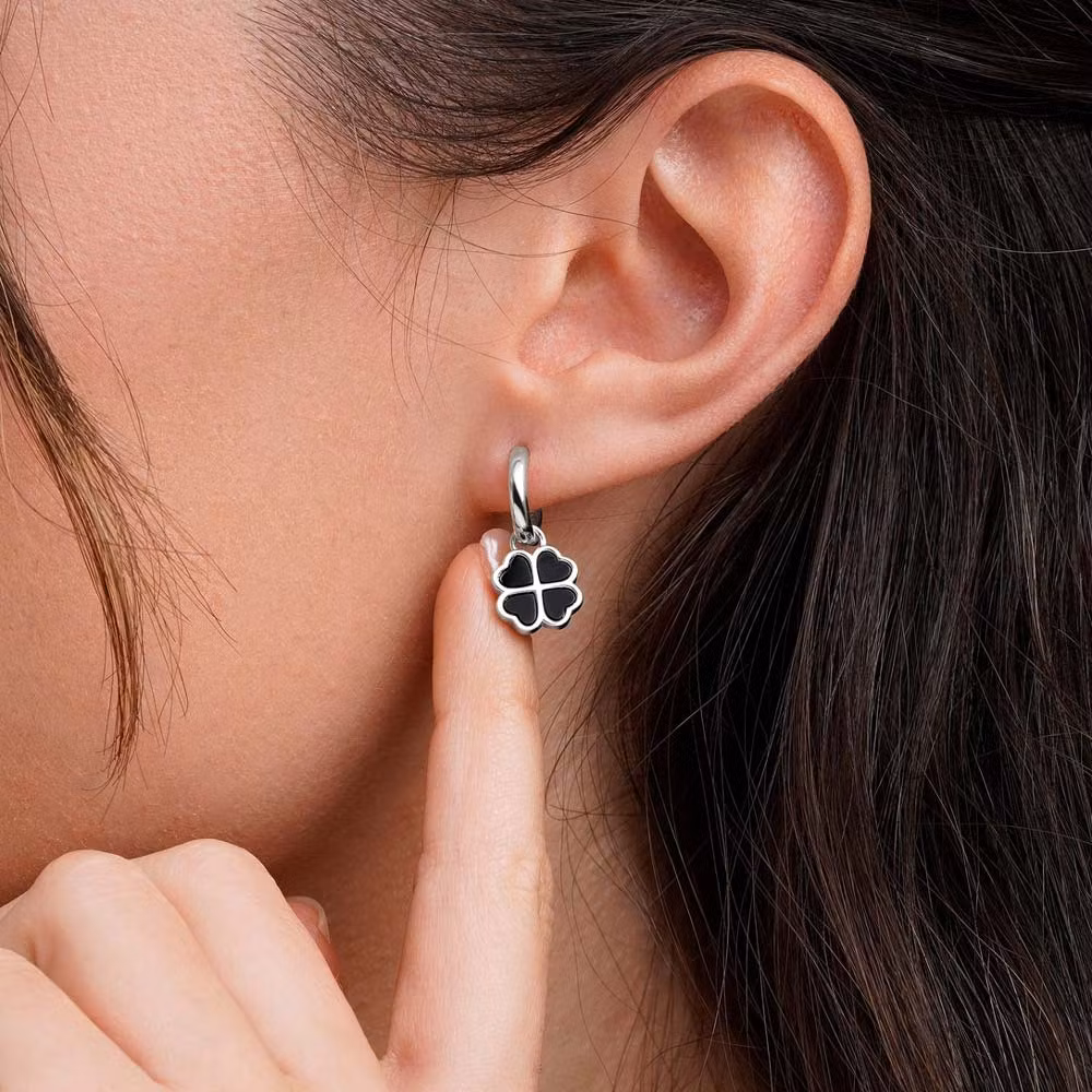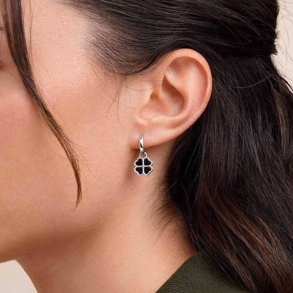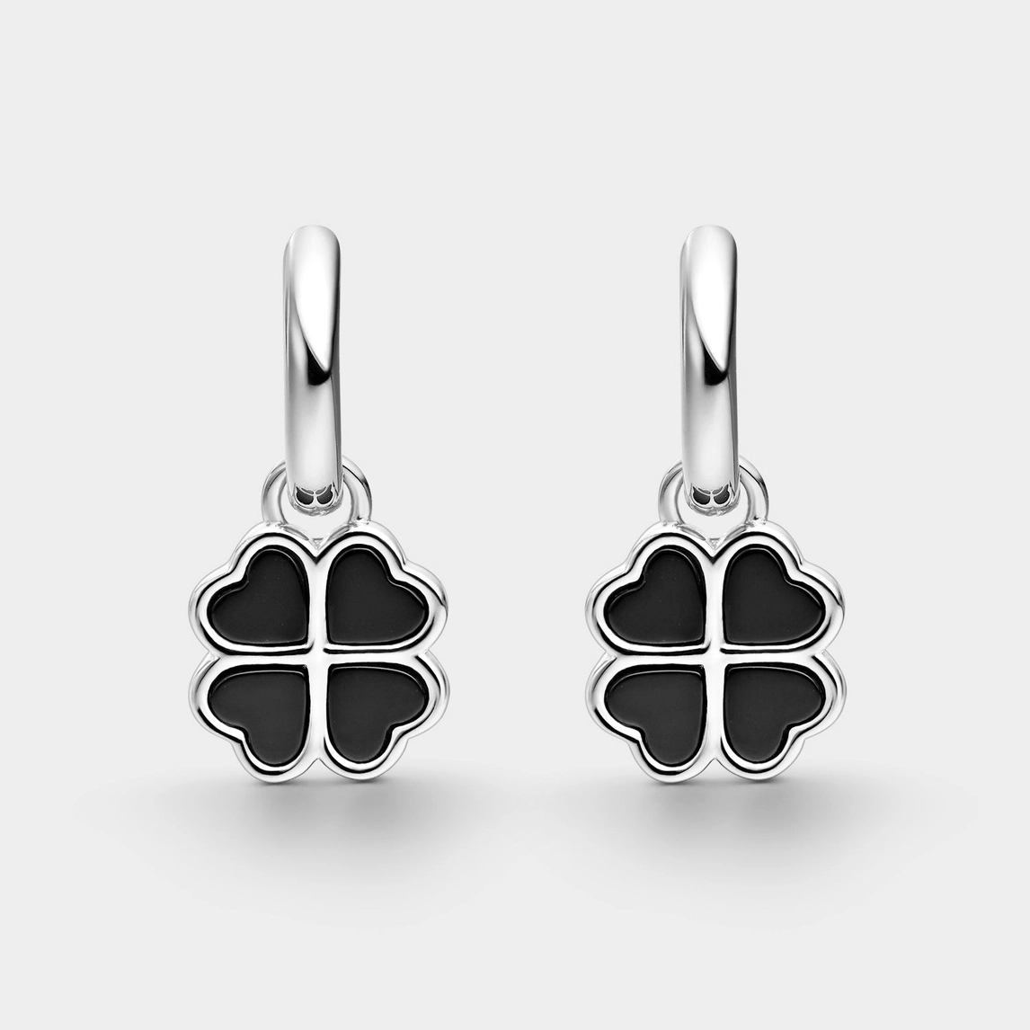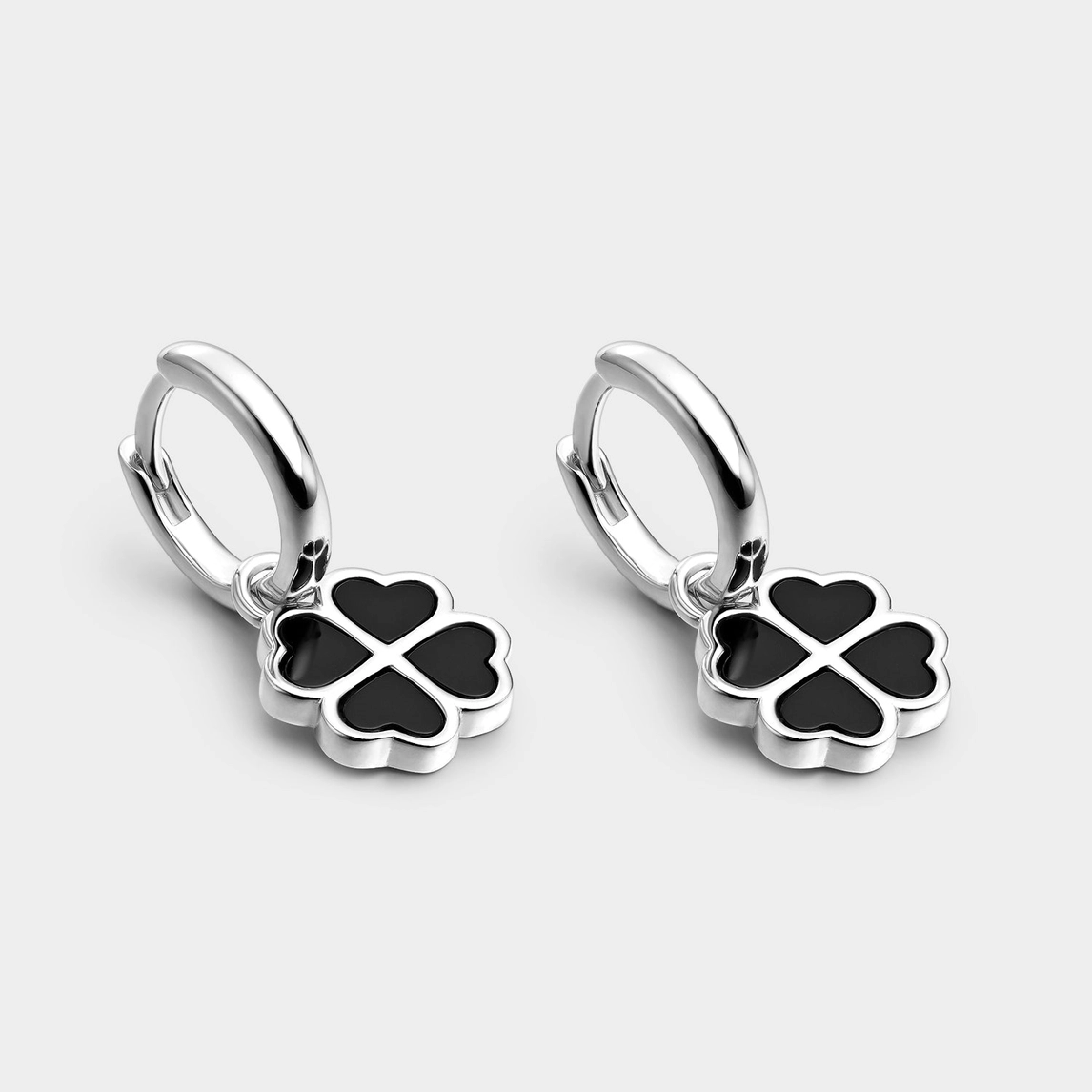 Eleganta silvercreoler med hängande klöver i svart onyx. Den stilrena designen ger ett sofistikerat uttryck, samtidigt som klövern symboliserar tur och skydd. Utrustade med smidigt klicklås för enkel användning. Det går att ta av fyrklöverna och bära creolerna utan hängen.