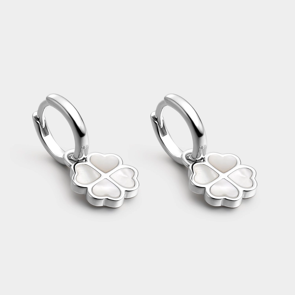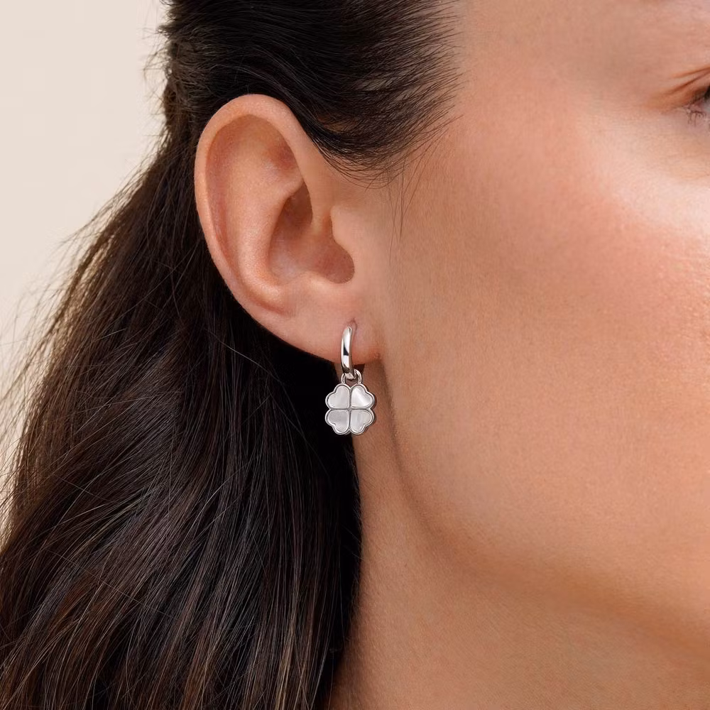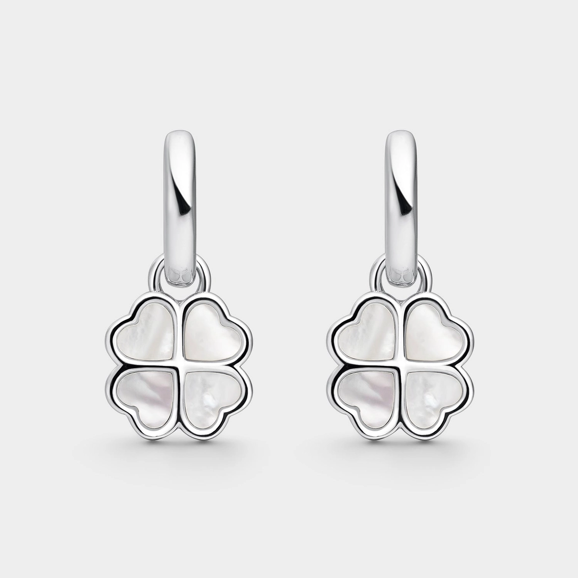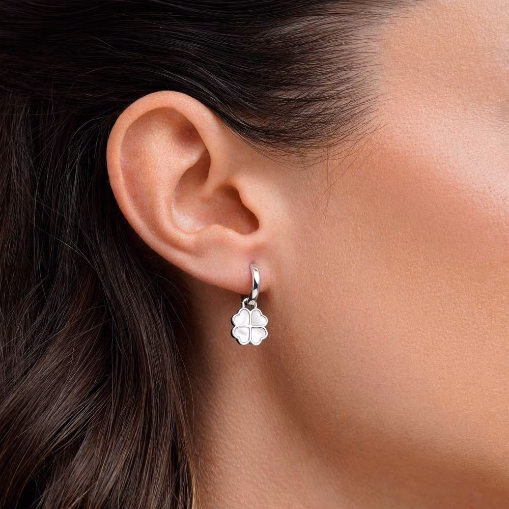 Silvercreoler med hängande fyrklöver i skimrande pärlemor. Den stilrena designen ger ett sofistikerat uttryck. Creolerna har gångjärn och klicklås för enkel på- och avtagning. Det går att ta av fyrklöverna och bära creolerna utan hängen. Fyrklövern symboliserar tur och lycka, vilket gör dessa örhängen till en uppskattad present.