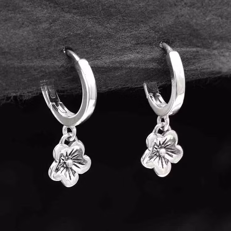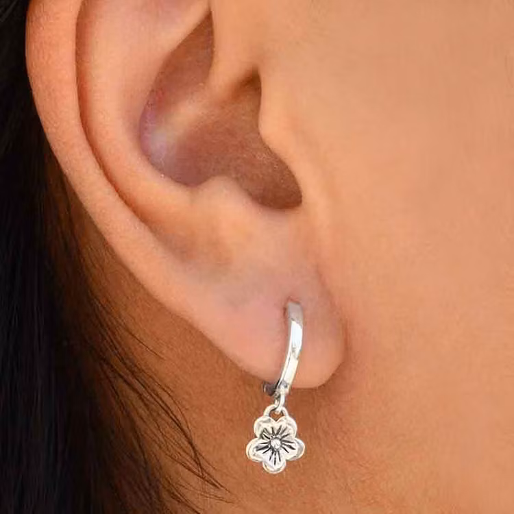 Silverörhängen med körsbärsblommor dinglande på stilrena huggies. Örhängena har gångjärn vilket gör det lätt att öppna upp dem och sätta på plats. De fästs enkelt med ett klicklås när de trycks ihop.