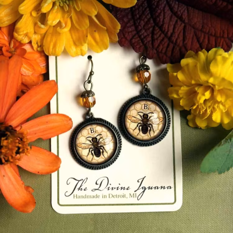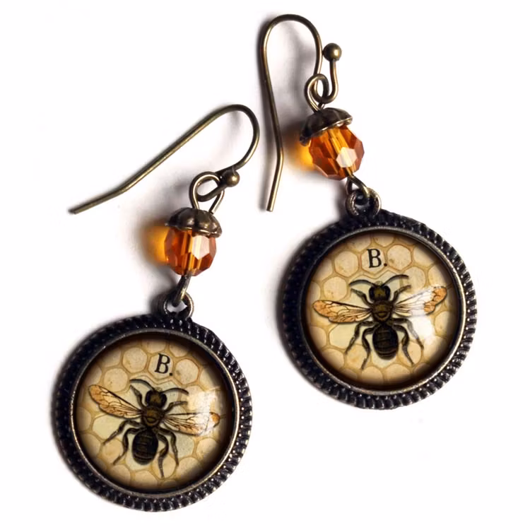 Vintageinspirerade örhängen med antikbronsfinish. Örhängena har en illustration av ett bi under en cabochon av glas samt en liten pärla överst.