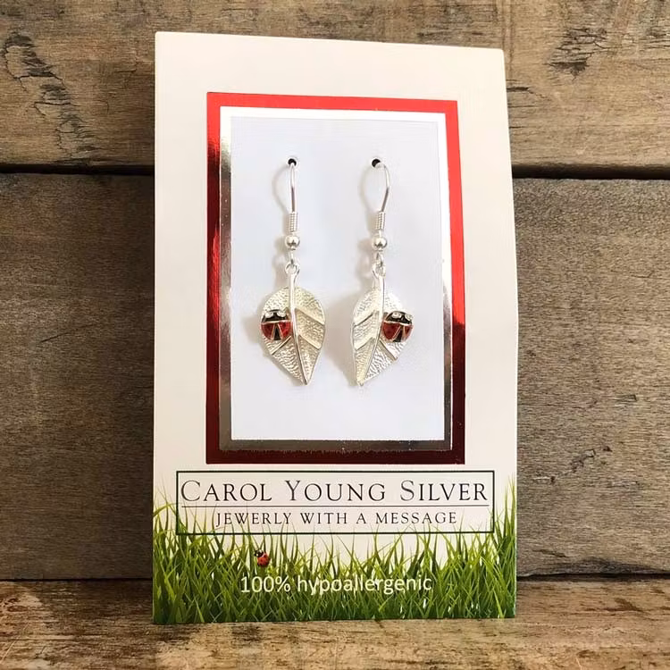 Örhängen i form av ett par nyckelpigor som sitter på var sitt silverfärgat blad som hänger under en krok. Nyckelpigorna är försedda med röd och svart emalj och med guldfärgade konturer. Ögonen består av två kubisk zirkonia. Örhängena är fästa på ett litet kort.