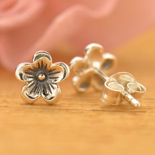 Stiftörhänge med en liten körsbärsblomma i silver.