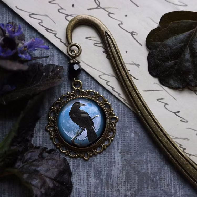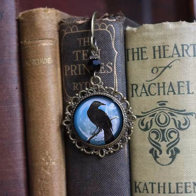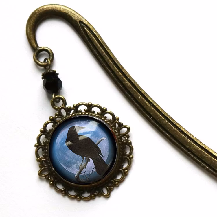 Stabilt och vackert bokmärke med ett dekorativt hänge som har en illustration av en kråkfågel under en cabochon av glas.