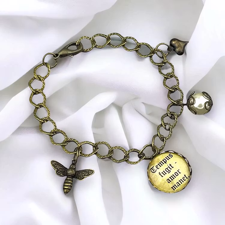 "Tempus fugit - amor manet." Översatt från latin betyder det ungefär "Tiden flyger - kärleken består". Det här armbandet med fyra berlocker varav en har budskapet under en glascabochon påminner oss om att leva i nuet.