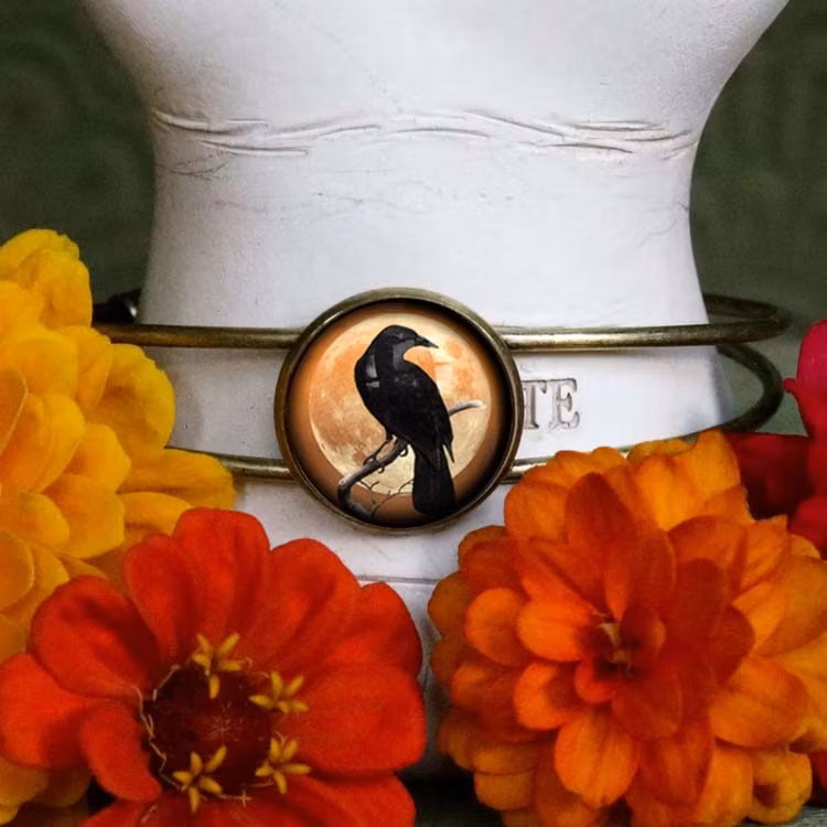 Stelt vintageinspirerat manschettarmband med antikbronsfinish. Armbandet har en fast berlock med en illustration av en fågel under en cabochon av glas.