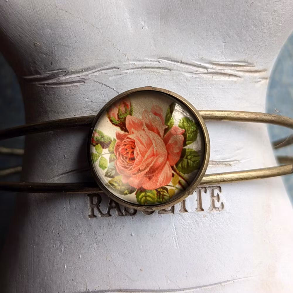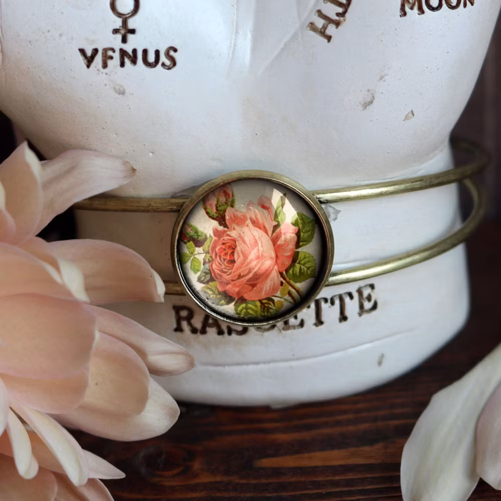 Stelt vintageinspirerat manschettarmband. Armbandet har en fast berlock med en illustration av en ros under en cabochon av glas.