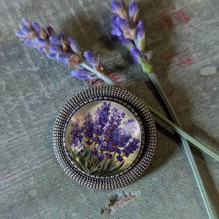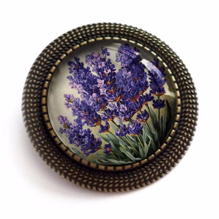 Vintageinspirerad brosch med antikbronsfinish. Broschen har en detaljrik illustration av lavendel under en cabochon av glas. På baksidan finns en liten nål att fästa broschen med. Smycket kommer från The Divine Iguana som du kan läsa mer om nedan.