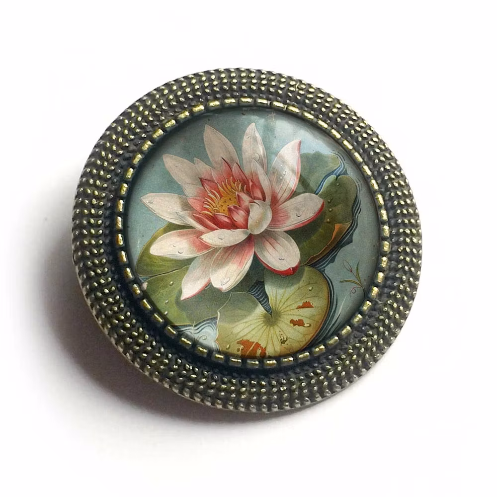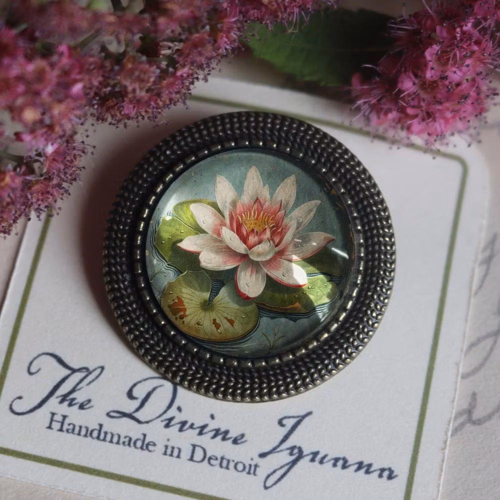 Vintageinspirerad brosch med antikbronsfinish. Broschen har en detaljrik illustration av en näckros under en cabochon av glas. På baksidan finns en liten nål att fästa broschen med. Smycket kommer från The Divine Iguana som du kan läsa mer om nedan.