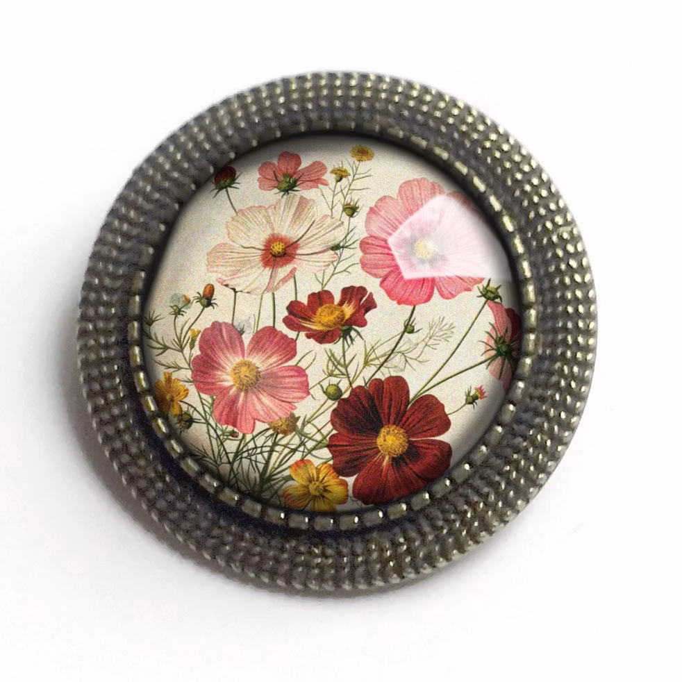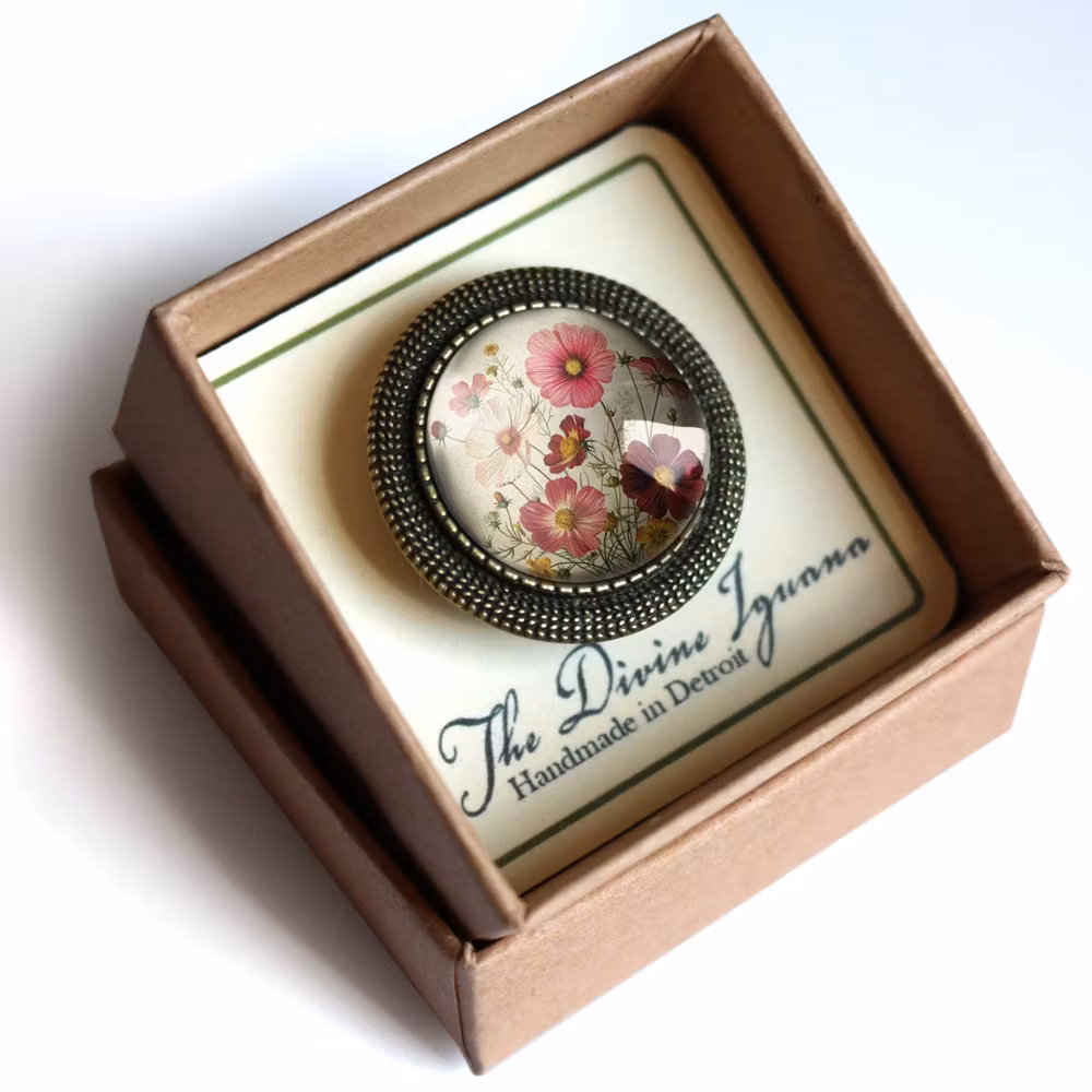 Vintageinspirerad brosch med antikbronsfinish. Broschen har en detaljrik illustration av rosenskära under en cabochon av glas. På baksidan finns en nål att fästa broschen med. Smycket kommer från The Divine Iguana som du kan läsa mer om nedan.
