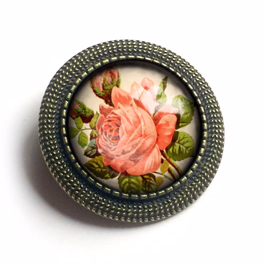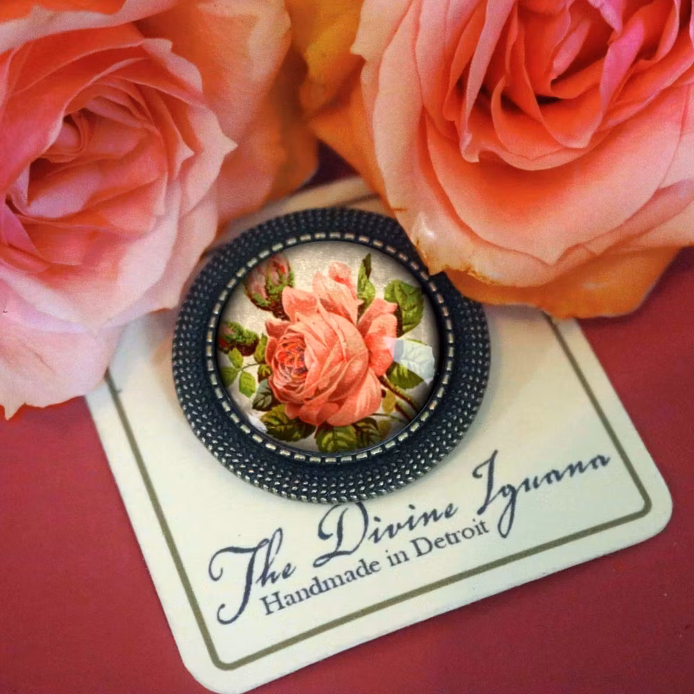 Vintageinspirerad brosch med antikbronsfinish. Broschen har en detaljrik illustration av en ros under en cabochon av glas. På baksidan finns en liten nål att fästa broschen med. Smycket kommer från The Divine Iguana som du kan läsa mer om nedan.
