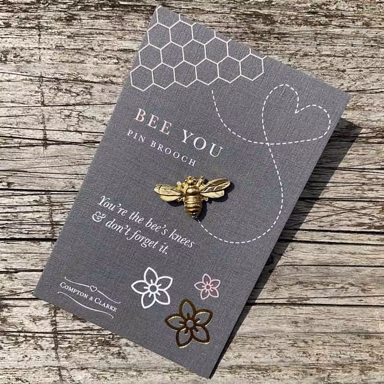Pin i form av ett litet bi – tillverkat av tenn som guldpläterats. Biet sitter fäst på ett kort med uppmuntrande text – perfekt att ge bort till någon som man vill ge lite extra uppskattning.