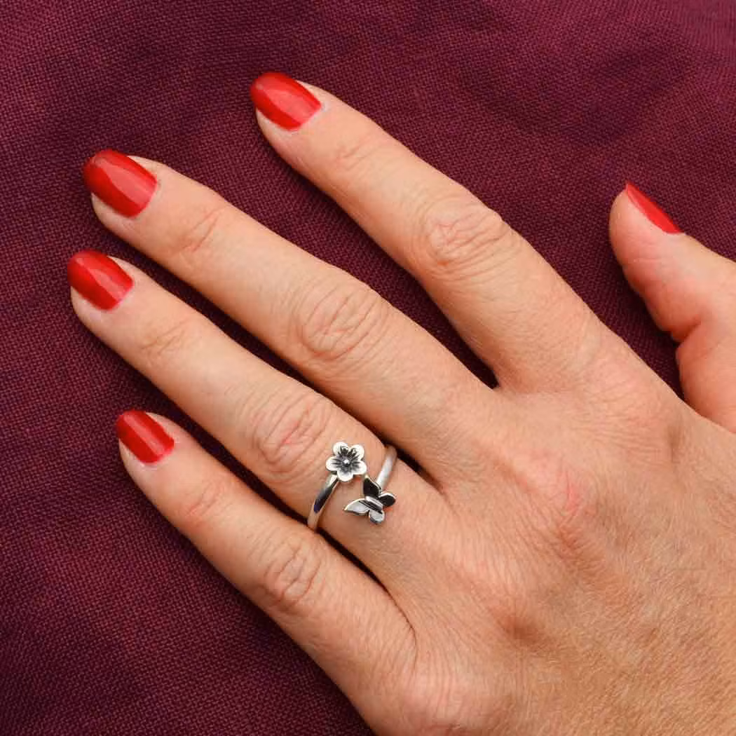 Ring med blomma och fjäril i silver. Storleken är justerbar eftersom ringen är öppen.