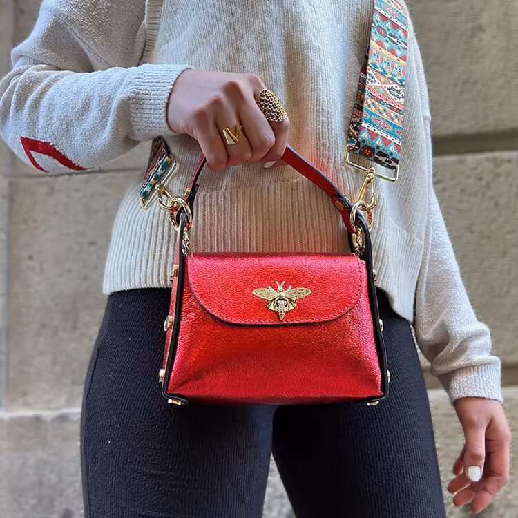 Elegant liten handväska för dig som gillar bin. Väskan är läcker med guldfärgade nitar längs sidorna och med ett bispänne på framsidan. Extra roligt är att bakkroppen på biet fungerar som själva låsanordningen för spännet. Väskan är tillverkad i läder och lätt att rengöra. Den har ett kort handtag samt en avtagbar kedja för att hänga över axeln eller diagonalt. (Se kedjans längd för att uppskatta hur den sitter på just dig.). Väskan har ett fack och är perfekt när du bara behöver ha plats för din telefon och plånbok.