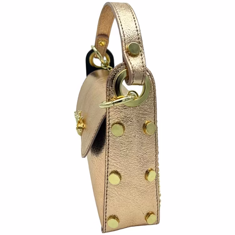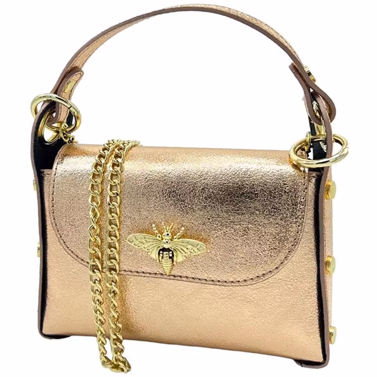 Elegant liten handväska för dig som gillar bin. Väskan är läcker med guldfärgade nitar längs sidorna och med ett bispänne på framsidan. Extra roligt är att bakkroppen på biet fungerar som själva låsanordningen för spännet. Väskan är tillverkad i läder och lätt att rengöra. Den har ett kort handtag samt en avtagbar kedja för att hänga över axeln eller diagonalt. (Se kedjans längd för att uppskatta hur den sitter på just dig.). Väskan har ett fack och är perfekt när du bara behöver ha plats för din telefon och plånbok.